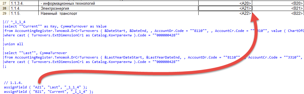 Field: Строка, задает поле отчета, куда выводить результат. В примере ниже, это А21.