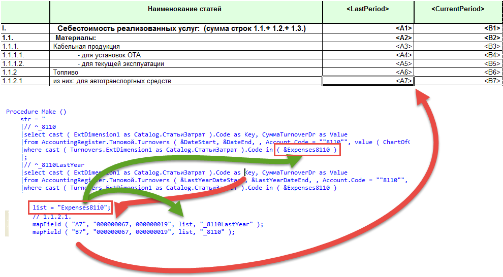 В примере на картинке показано, как коды статей затрат мапятся к полям отчета. На картинке видно, что суммы кодов статей 000067 и 000019 будут включены в A7 и B7 (в соответствии с источником данных).