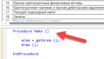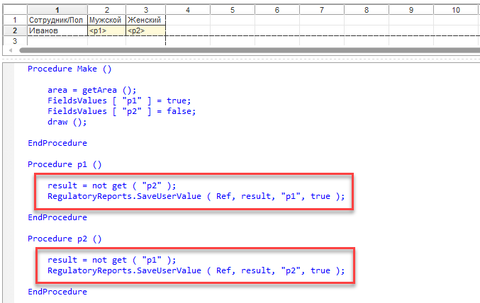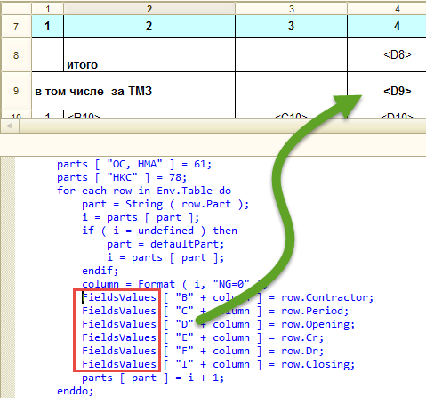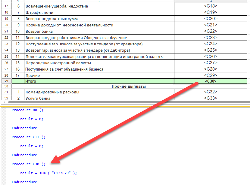 Каждый параметр отчета, рассчитываемый по какой-то формуле, должен иметь соответствующую процедуру в модуле. Например, на картинке ниже показан параметр C30 и процедура его расчета:
