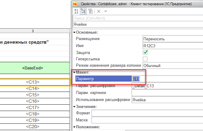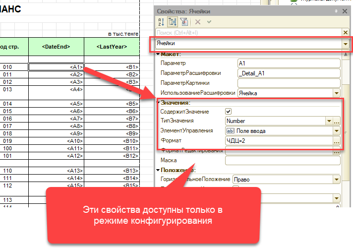 Для любой ячейки отчета можно указать тип содержащегося в нем значения. Однако, данная функция недоступна в пользовательском (1С:Предприятие) режиме редактирования макета. Разработку форм отчетов, для которых есть необходимость в задании типа вводимых значений, необходимо вести в режиме 1С:Конфигуратор. В этом режиме, система позволяет задавать дополнительные свойства ячейкам: