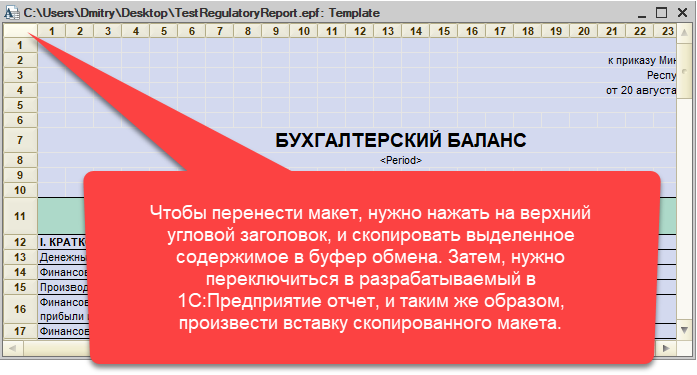 После разработки формы в конфигураторе, её следует перенести в редактируемый отчет, используя обычное копирование/вставку: