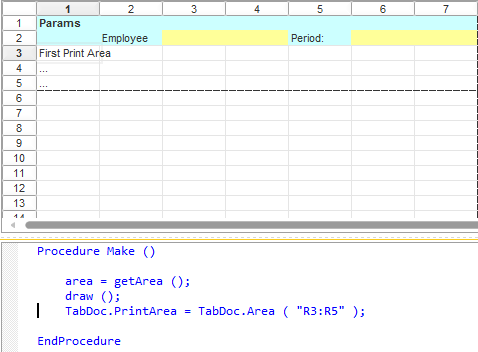 В некоторых случаях, требуется разработать регламентированный отчет, с некоторыми дополнительными входящими параметрами, при этом требуется, чтобы сами параметры в отчет не выводились. Для решения такой задачи, можно воспользоваться свойством PrintArea табличного документа: